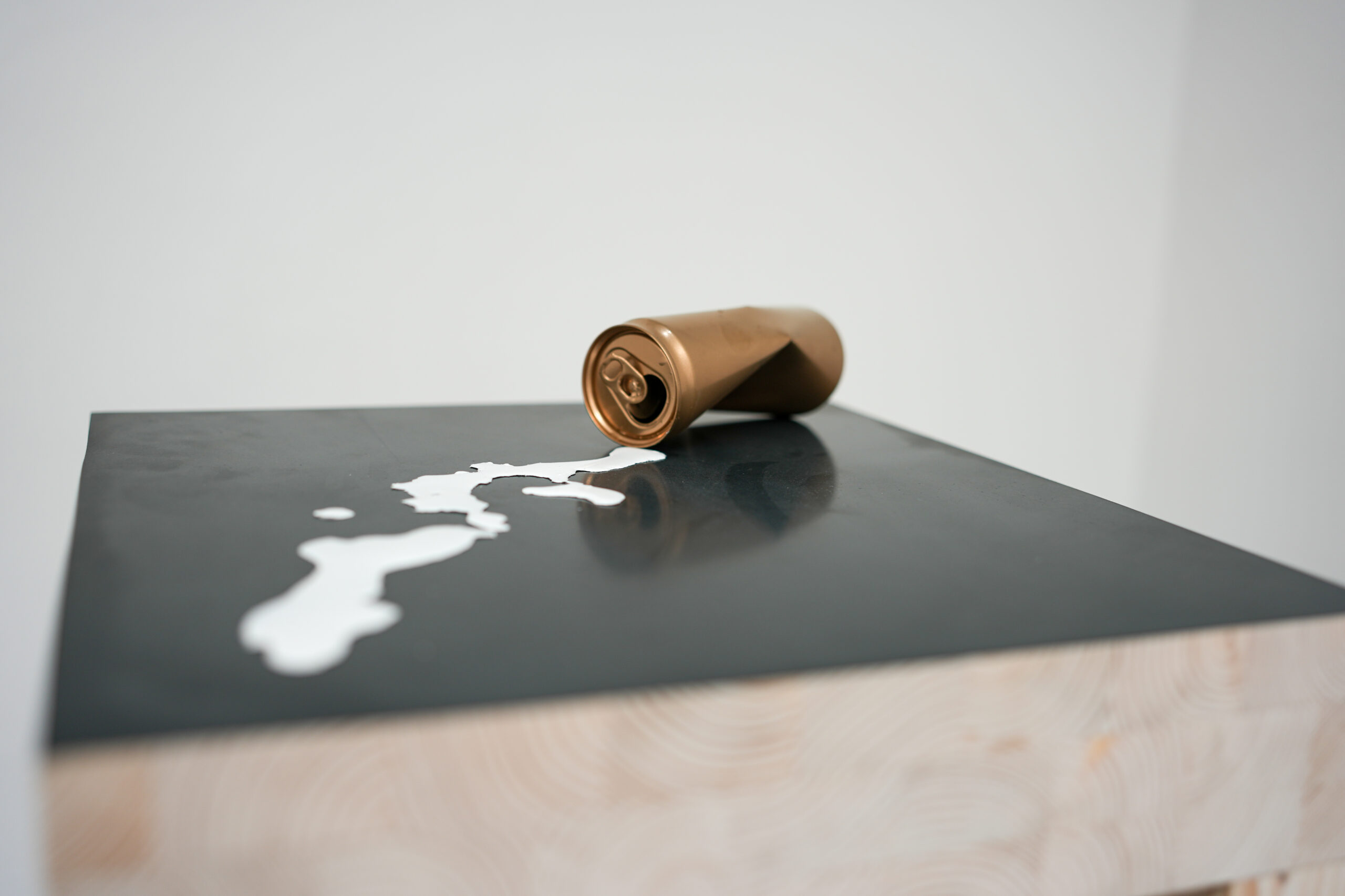 It’s just a dented cola can—only now it’s gold. It sits on the matte black surface of a small, perfectly square table I built, still letting go of its last drop of some unknown, neutral, white liquid. A tiny, ordinary moment, frozen.